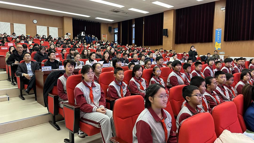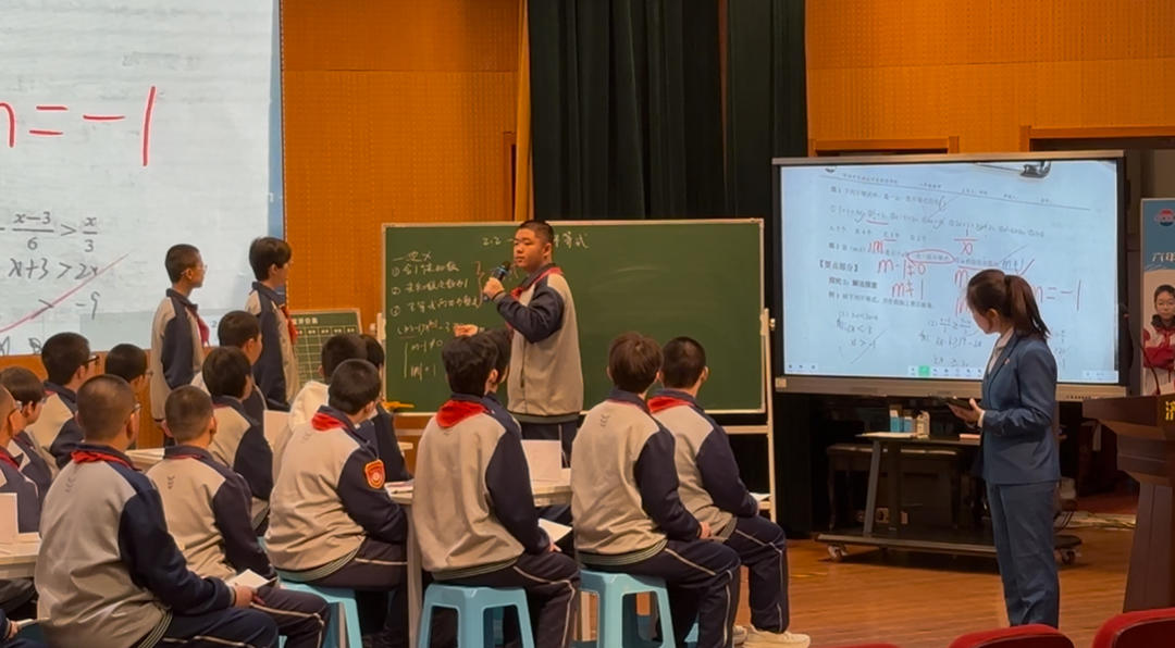 “小先生”系列展示成为年会亮点。七年级二班“小先生”带领同学赏析经典课文,以问题驱动讨论、结合背景资料深化理解,完整呈现“领学七要素”“讲解四步骤”培养成果,指导教师仅在关键处点拨,展现“以学为中心”的课堂新样态;六年级数学“小先生”以无彩排、原生态的抽题讲题形式,展现扎实的数学思维与逻辑表达能力;八年级数学展示中,“师生双师”协作模式生动呈现,学生与教师并肩引导课堂进程,重构课堂教学关系。