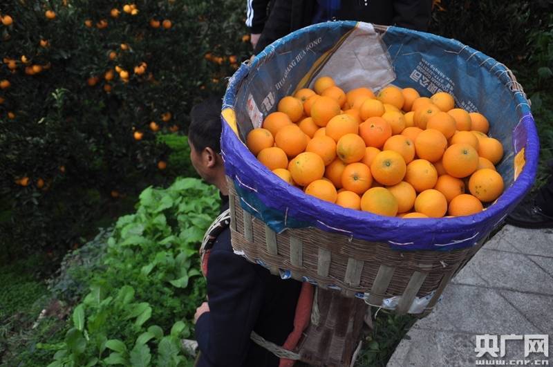 图为村民在果园中进行脐橙采摘及搬运工作(央广网记者 王子衿 摄)